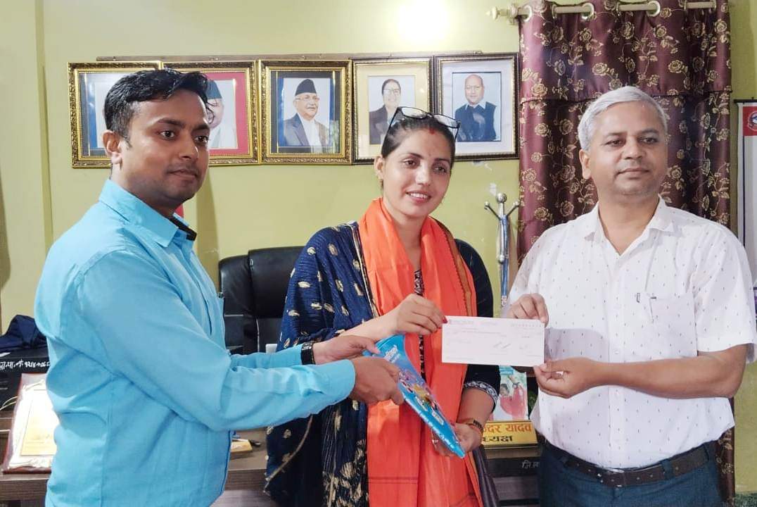 जनकपुरधाम, २९ साउन । जनकपुरधाम स्थित केपी खबर डट्कमको म्यानेजिङ्ग डायरेक्टर (एम डी)को रुपमा कार्यरत पत्रकार निभा कुमारी झालाई स्वास्थ्य बीमा वापतको सुविधा रकमको चेक हस्तान्तरण गरिएको छ ।