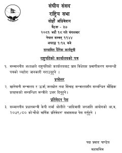 बैठकमा अध्यक्ष नारायणप्रसाद दाहालले राष्ट्रपतिको कार्यालयबाट प्राप्त विधेयक प्रमाणीकरण सम्बन्धी पत्र पढेर सुनाउनेछन् ।