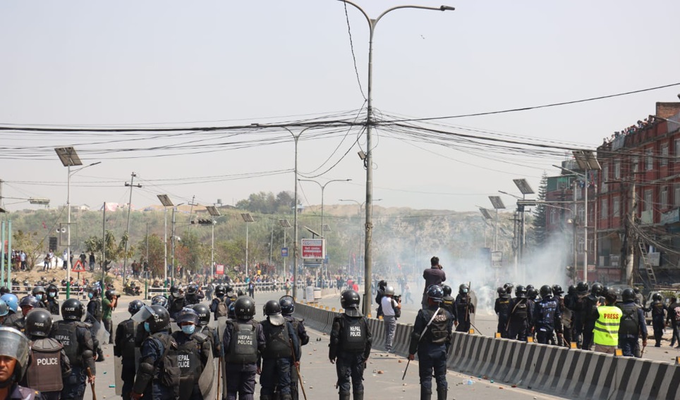 उनीहरूले प्रहरीलाई ढुंगा हान्दै अगाडि बढाएको गाडीले प्रहरीको घेरा तोडेर बानेश्वरतर्फ अघि बढेको थियो । त्यसपछि प्रहरीले अश्रुग्यास, लाठी चार्ज र पानीको फोहोरा प्रहार गरेको थियो ।