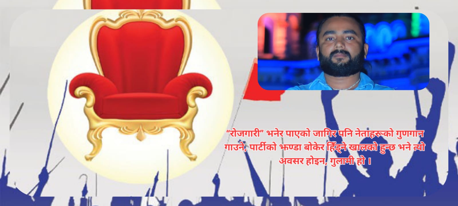 तर जब उनीहरूले सरकारी संयन्त्रसँग सहकार्य गर्न खोज्छन्, तब उनीहरू भ्रष्टाचार, ढिलो प्रक्रिया, र नेताहरूको ‘आफन्तवाद’ मा अल्झिन्छन् । “रोजगारी” भनेर पाएको जागिर पनि नेताहरूको गुणगान गाउने, पार्टीको झण्डा बोकेर हिँड्ने खालको हुन्छ भने त्यो अवसर होइन, गुलामी हो ।
