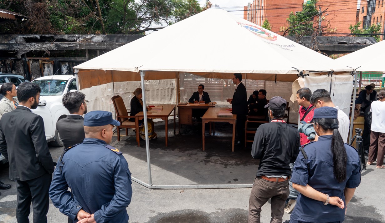 २४ भदौको आगजनीपछि खरानी बनेको सर्वोच्च अदालतले नौ दिनपछि सांकेतिक रूपमा भए पनि न्यायिक कामकाज सुरु गरेको हो। आगजनीबाट बाँकी रहेका केही कुर्सी र टेबुल र एउटा त्रिपालको सहारामा सर्वोच्च अदालतले खुला आकाशमुनि इजलास सञ्चालन गरेको हो ।