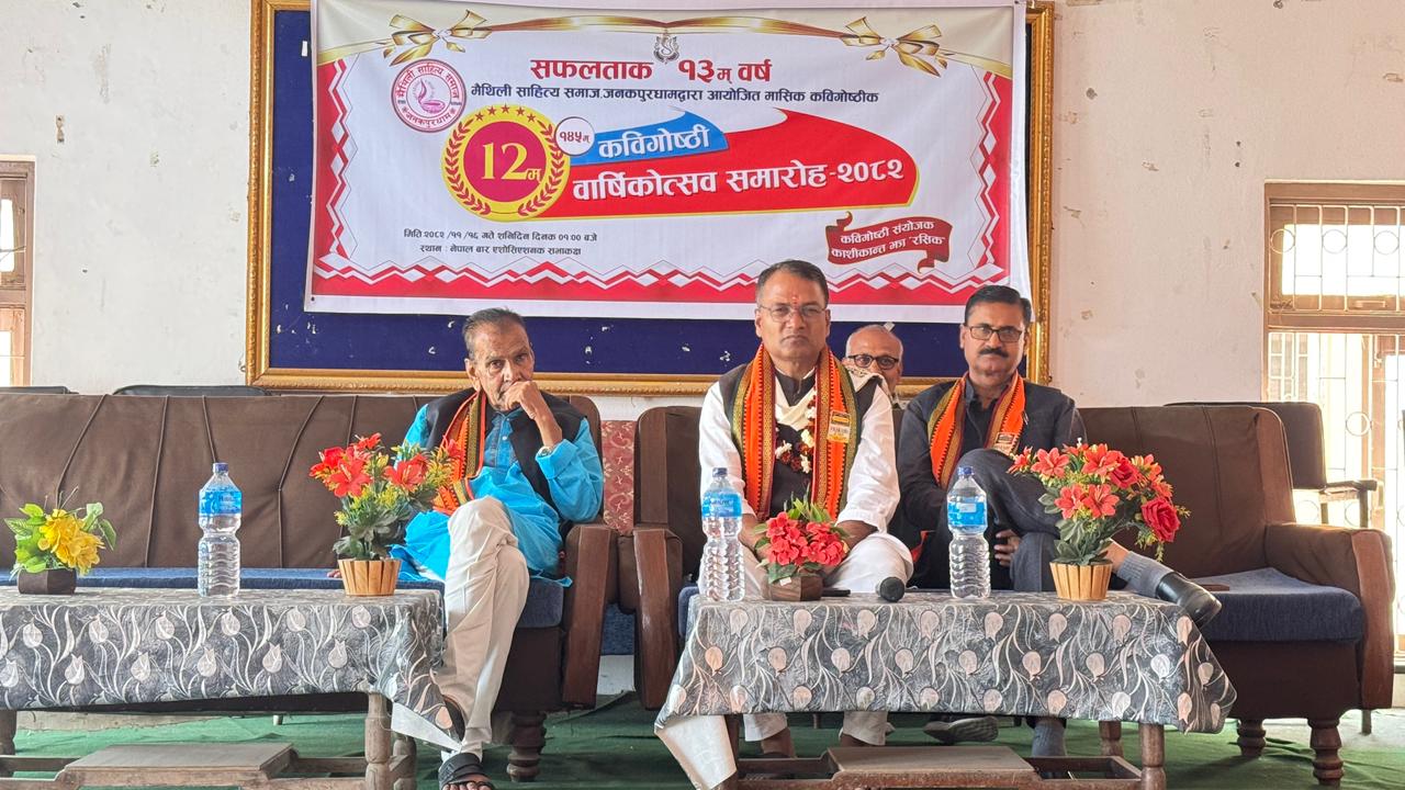जनकपुर, १६ फागुन। मैथिली साहित्य समाज जनकपुरद्वारा आयोजित मासिक कविगोष्ठीको १२औँ वार्षिकोत्सव समारोह भव्य रूपमा सम्पन्न भएको छ।