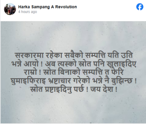 सामाजिक सञ्जालमार्फत उनले स्रोत नखुलेको सम्पत्तिलाई अप्रत्यक्ष रूपमा भ्रष्टाचार मान्न सकिने बताएका हुन् ।