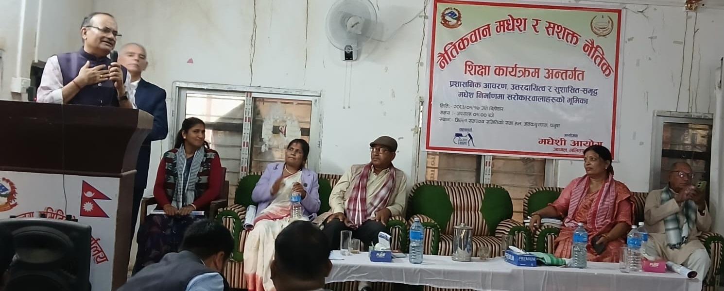 मधेसी आयोग र इन्सेकको सहकार्यमा जनकपुरमा आयोजित कार्यक्रममा उनले नैतिक मूल्य कमजोर हुँदा प्रशासनिक अनुशासन र पारदर्शितामा चुनौती आएको उल्लेख गर्दै शिक्षादेखि नै नैतिकता विकास गर्नुपर्नेमा जोड दिए ।